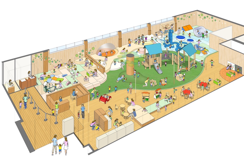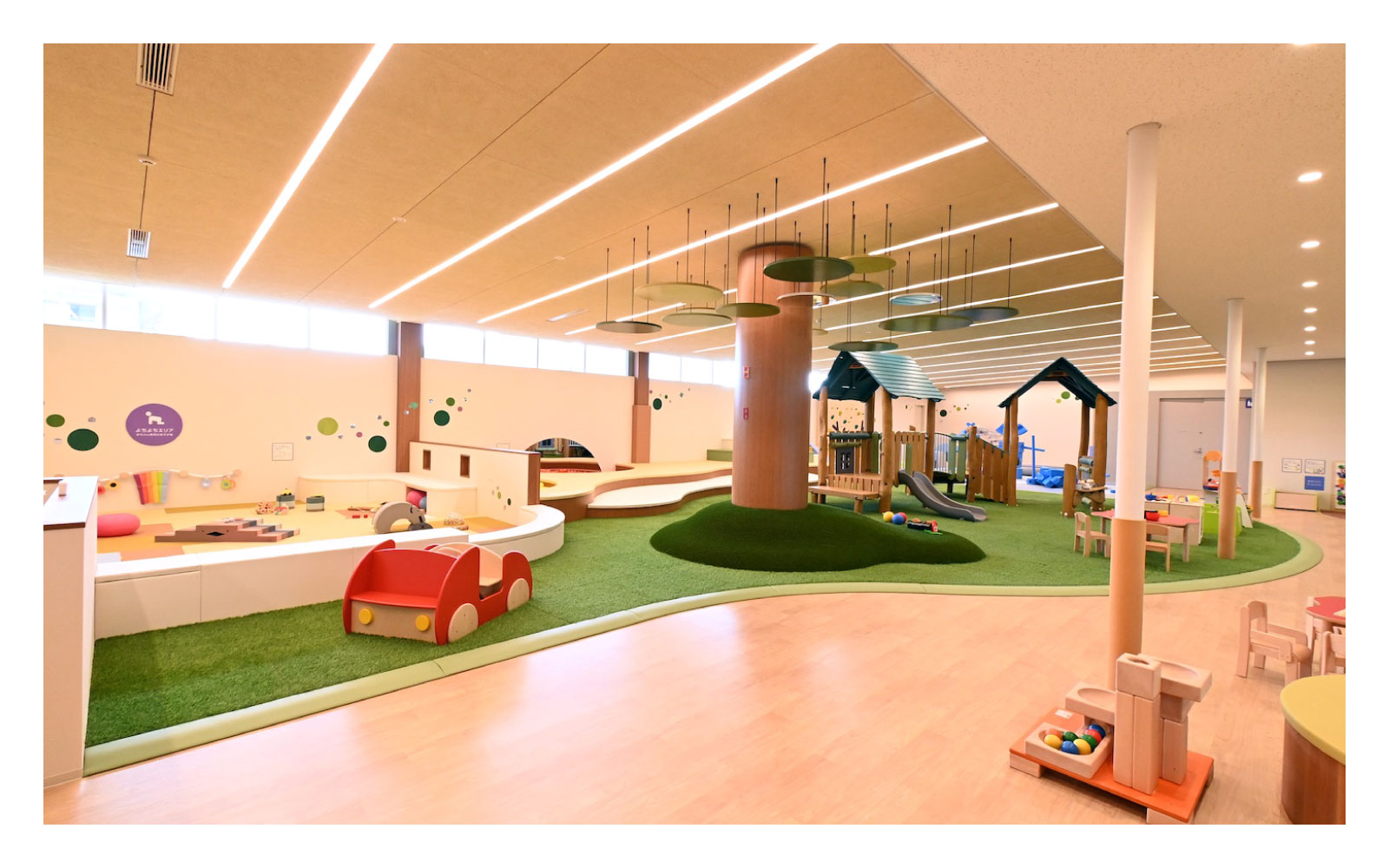 施設内は大きく思いきり身体を動かす【わくわくエリア】、ごっこ遊びなど表現できる【すくすくエリア】、乳幼児のお子様が楽しめる【よちよちエリア】異年齢児との交流・休憩のできる【つどいのひろば】の4つのエリアに分かれています。空間をひとつにすることで、子どもの「ワクワク」を引き出しながら、それぞれのエリアで、子どもたちが自然と思いきり遊べる空間となっています。
